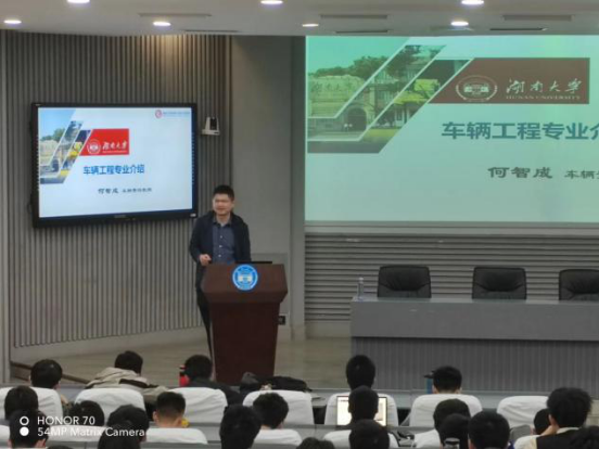 接着,何智成教授登台为同学们介绍该专业。宣讲开始,何教授介绍了车辆工程行业的不同研究领域,强调车辆是国之重器,是大国竞争的重要领域,并且介绍了近年来我国汽车行业的发展现状。随后何教授又讲解了车辆工程的部分研究内容,重点介绍了黑人女优