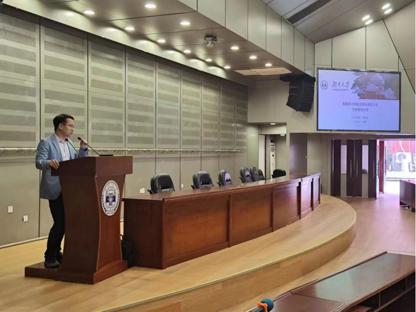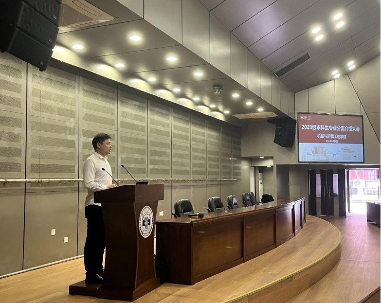 本科2023级机械类分流专业介绍大会在逸夫楼报告厅举行。机械院龙湘云、夏百战、张凯、张冠军等专业教师,教务办教学秘书刘会铭,本科2023级辅导员黄敏出席本次大会,大会由黄敏主持。