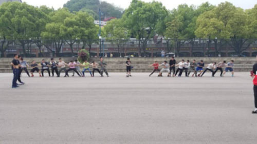 本科2017级在荫马塘举行了拔河比赛,比赛采取三局两胜制,以班级为单位,每班派出10人。