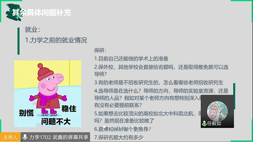 本科17级力学系围绕“力学专业本科生发展:研究生、工作或出国”为主题,召开了一次线上主题班会,使同学们对于未来的发展有了更清晰的认识和规划。力学系主任方棋洪老师、支部书记任毅如老师、院长助理周加喜老师、副主任韦凯老师、张海成老师、冯慧老师以及17级力学全体学生参加了本次班会。