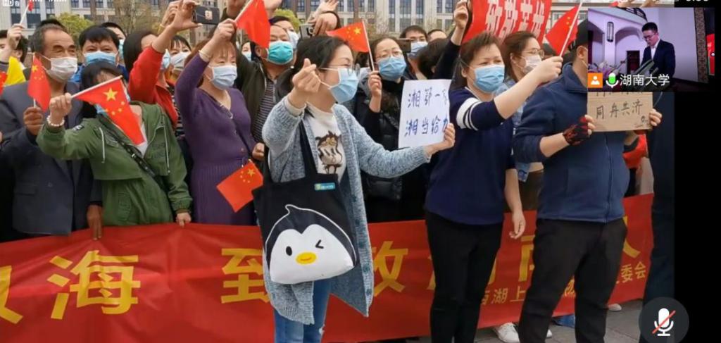 会上,主持人介绍了几位校友在疫情期间奋战于各行各业最前线的英姿,用一个个故事打动了在场的各位师生。一位从事记者行业的校友在疫情期间不惧被病毒感染的风险,深入病房,深入患者,深入医疗人员之中,以镜头记录下抗疫众生相。他看到有老人难以忍受隔离带来的孤独,像孩子一样让护士陪他聊天,他看到有医护人员脱下厚重的防护服后,才惊觉衣物早已被汗水打湿。他以独特的视角记录下了疫情下的无助与希望,病房里的痛苦与奉献。固然,他也畏惧病毒,担心家人朋友,但正是他那种职业精神与家国情怀所包含的大无畏,为全民抗疫这段难以忘怀的艰难历史的记录作出了不可磨灭的贡献。另一位负责火神山项目建设的校友在那段艰苦时光中,时时刻刻与同事们战斗在基建第一线。由于恰逢春节,当时留在武汉的工友不多,加紧建设任务便越发刻苦,以至于一旦有人需要帮忙,其他许多工友——即使刚刚坐下休息——也会起身相助。作为统筹规划的负责人,这位校友为了保障工程在武汉多雨的情况下顺利完成,通过多种途径联系材料商,为工地搭建了大雨棚,大大加快了施工进度。他为工程加速贡献的每一分力,都为苦苦等待床位的患者们增加了一线生机。他与在工地上流汗的工人朋友们一样,是为抗疫有着伟大贡献的逆行者。校友们的感人故事不仅感染了在场的师生们,也让身处分会场的同学们感受到了岳麓子弟在国难面前的一片赤诚之心。黑人女优