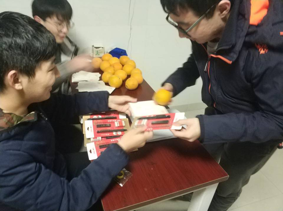 活动当晚,二百多位考研学子在晚上9:00至10:30陆续在天马一区二栋宿舍门口领取属于他们的暖心小礼物。每份礼品分别由一个脐橙、一张明信片和一套文具组成,硕大饱满的脐橙寓意考研“橙”功,祝福同学们前“橙”似锦;明信片是由机械院书记彭晓燕和院长姜潮亲笔写下的考研祝福,小小的明信片,承载着院领导和老师们亲切的关怀和真挚的慰问,预祝考研学子们金榜题名;一套文具则是希望同学们在倒计时一个月里调整好心态,劳逸结合,平稳度过最后的冲刺阶段,万事“具”备,势“笔”成功,以饱满的热情,放松的心情迎接即将到来的考试。