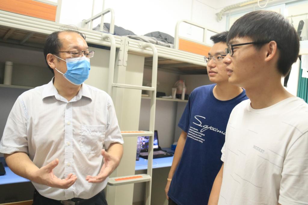 每到一间寝室,老师们都热情地和新生交谈,亲切地问询同学们的家庭情况,对新环境的适应程度,入学以来遇到的问题等等。同学们对于老师们的到来也非常高兴,热情回应着老师们的关心,寝室里充满欢声笑语。