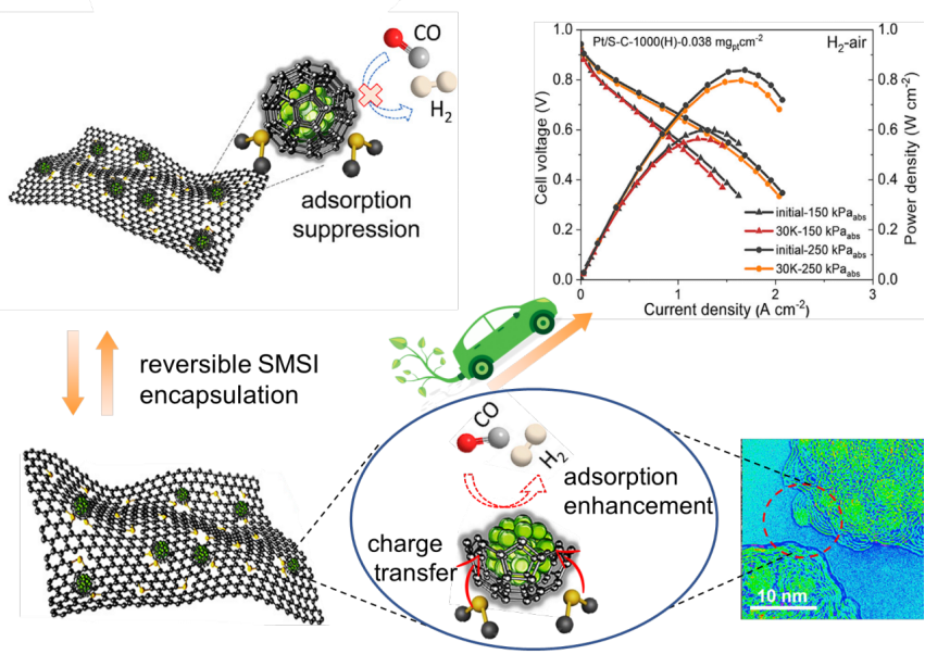 该文章重点评论了用于燃料电池电极的一种新型催化剂制备方式,此方式在高温情况下将金属载体强相互作用(Strong Metal-Support Interaction, SMSI)引入铂—硫掺杂碳载体。此电极催化剂在出色抗熔融能力(高达1100 °C)基础上,同时提供了SMSI碳层封装结构,最终在实际质子交换膜燃料电池系统中达到了极好的抗腐蚀能力。该文章也对燃料电池及水电解制氢电极结构及材料研究方向(如单片燃料电池或电堆测试方法、催化剂碳层封装结构状态、防中毒性能、以及部件产业化等)提供了若干指导性意见。