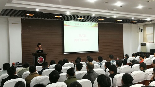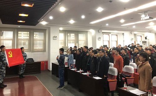 奏唱国歌后,易洪波宣读参加本次宣誓的预备党员名单。在热烈的掌声中,各支部新党员代表上台,由参会的领导和老师将党徽佩戴在他们胸前;其余新党员同志们起立,互相佩戴党徽、握手祝贺。在鲜红的党旗下,17级本科生代表万子航同学作为领誓人,带领大家举起右手,逐句庄严宣读入党誓词。