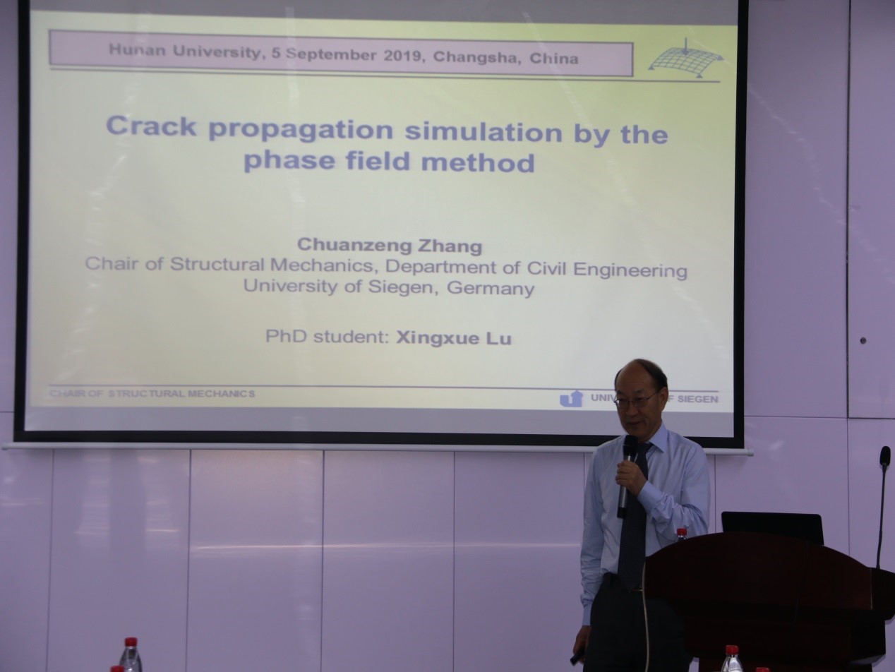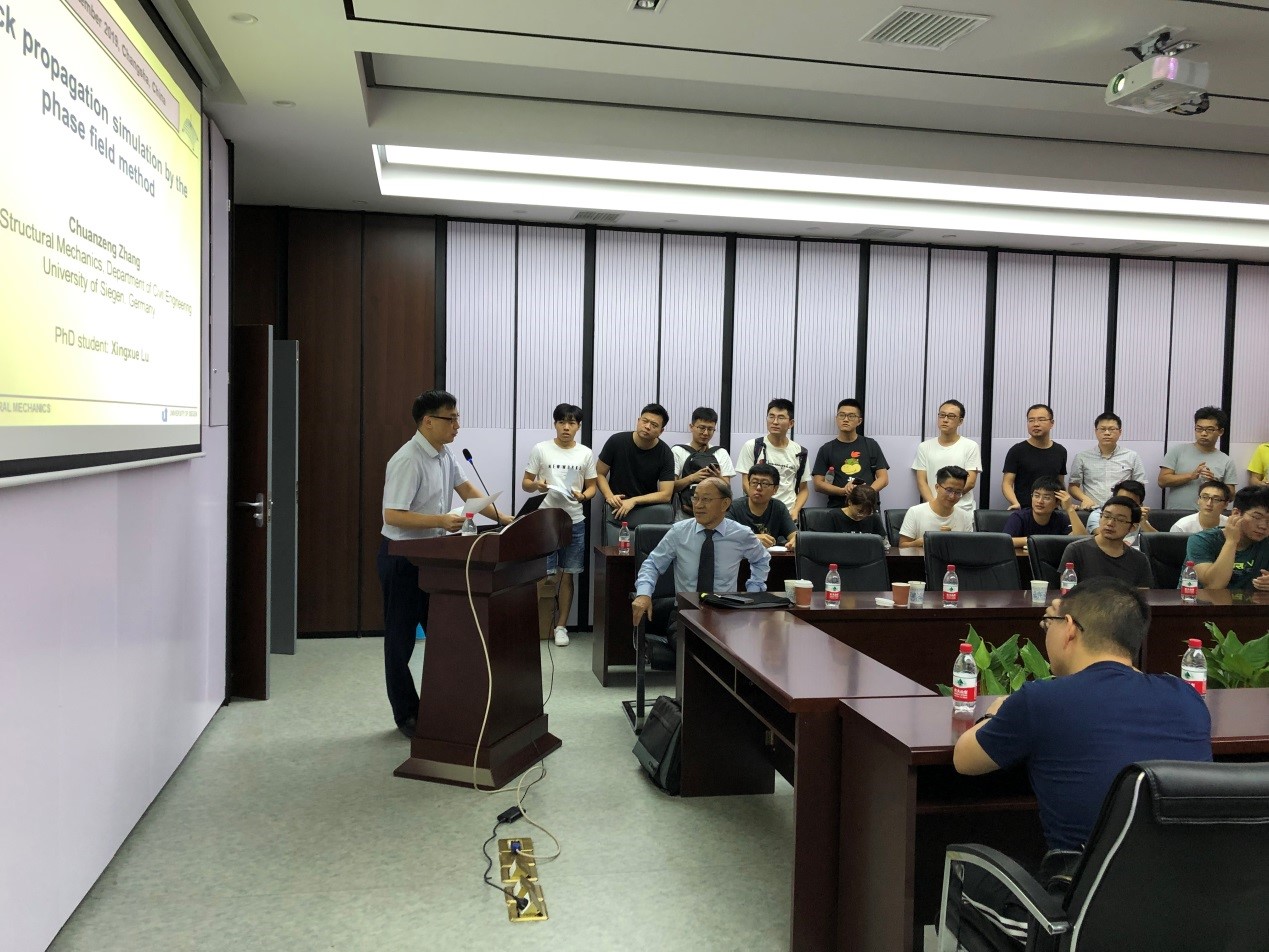 报告中,张传增院士主要就工程材料和结构中裂纹扩展的数值模拟介绍了团队的主要研究成果。首先,张院士指出裂纹扩展的数值模拟是断裂力学和计算力学中一个具有挑战性的难题,传统有限元方法和扩展有限元方法在裂纹扩展问题的数值模拟中存在着一些本质的缺陷。随后,张院士引出“相场模型(Phase field model)”来解决这一难题,为我们深入浅出的介绍了相场模型的基础理论和数学推导,进而展示了相场方法具有不需要断裂准则,可以自动考虑裂纹萌生、扩展和分枝现象以及需要重新划分网格等优点。最后,通过几个二维和三维数值算例,说明了相场方法与其它数值方法相比的优势。报告结束后,大家纷纷向张院士提问请教,张院士都一一给予了耐心、细致的解答。现场讨论热烈,大家都收获颇丰。