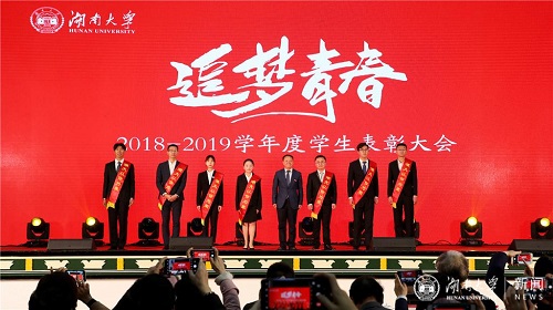 12月17日晚,2018-2019学年度学生表彰大会在大礼堂举行。校长段献忠发表讲话,并为先进个人和先进集体代表颁奖、佩戴“湖大以你为荣”绶带。“倪正东奖学金”设奖者、我校校友、清科集团董事长倪正东,校领导曹升元、陈伟、于祥成、徐国正等出席活动。副校长李树涛宣读表彰决定。