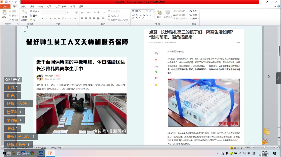 董志主任在解释上级政策要求的同时,也针对她在现实中观察到的具体情况提出了几点建议,如正确选择和佩戴口罩、关注遵守当地防疫政策等。最后,董主任强调了在特殊时期“做好师生员工人文关怀和服务保障”等工作的重要性。