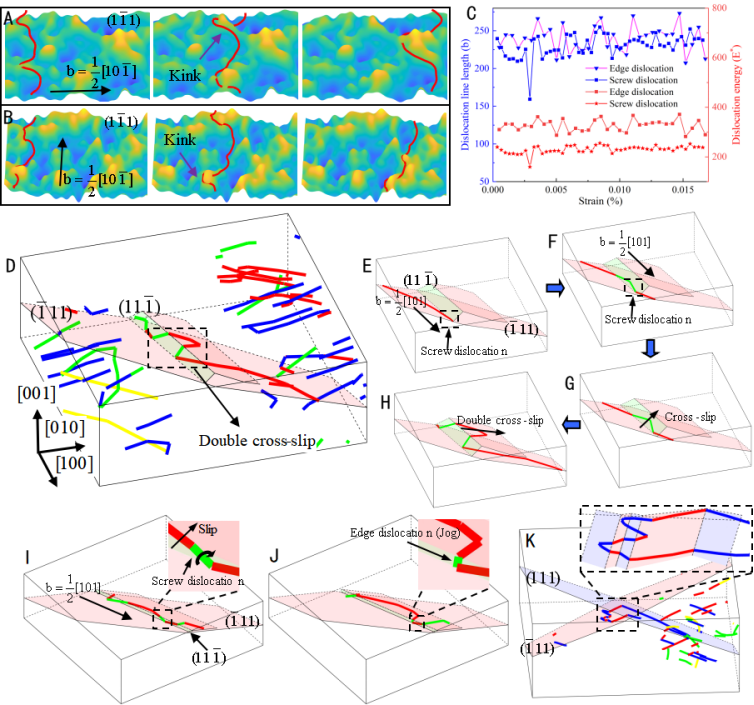通过统计分析原子尺度晶格应变阐明了高熵合金非均匀晶格应变的分形特性,利用随机场理论将非均匀晶格应变场嵌入连续介质模型中,开发了非均匀晶格应变依赖的三维离散位错动力学方法,发现了非均匀晶格应变导致多重扭折/割阶和多向多重交滑移的不寻常位错行为,为探明高熵合金高强韧的起源提供了新的视角。