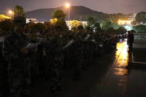 全体2019级新生完成了报道,准备踏上军训的征程。同日晚,物电院前的广场上,青春蓬勃的少年们在辅导员和新生助理们的带领下,喊出响亮坚定的口号,正式吹响军训的号角。